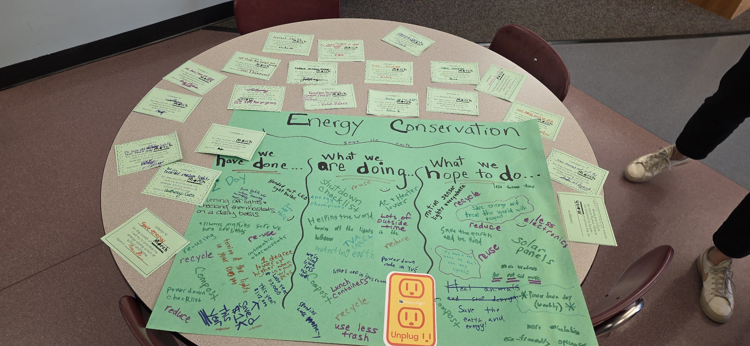 Student leadership also plays an important role in our sustainability efforts. Every classroom has designated “Energy Champions.” These are students who take on the responsibility of helping the community stay mindful of energy use. These students created checklists to remind the community to turn off lights, conserve water, and minimize unnecessary waste. This system fosters collaboration and a sense of ownership across the campus.